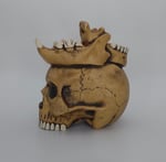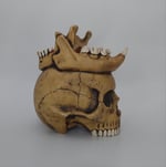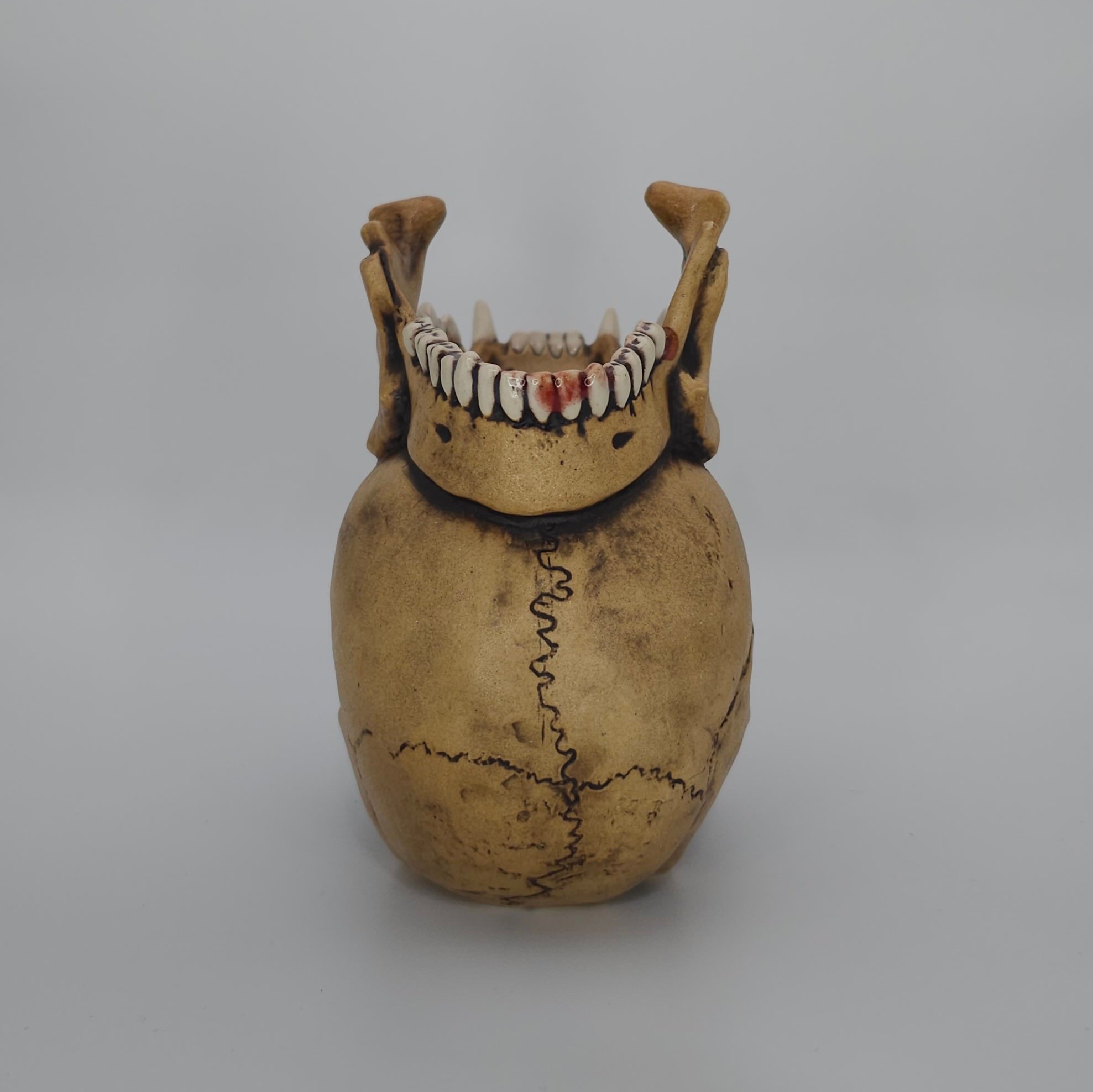 Ceramic skull mug with jaguar and human jawbone crown. Fired to cone 6 (2232 degrees Fahrenheit) and can hold 12-13 ounces, perfect for your favorite cocktail, beer, coffee, or the blood of your enemies. Stop drinking like a peasant, drink like a king!