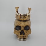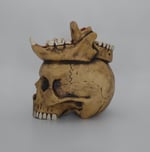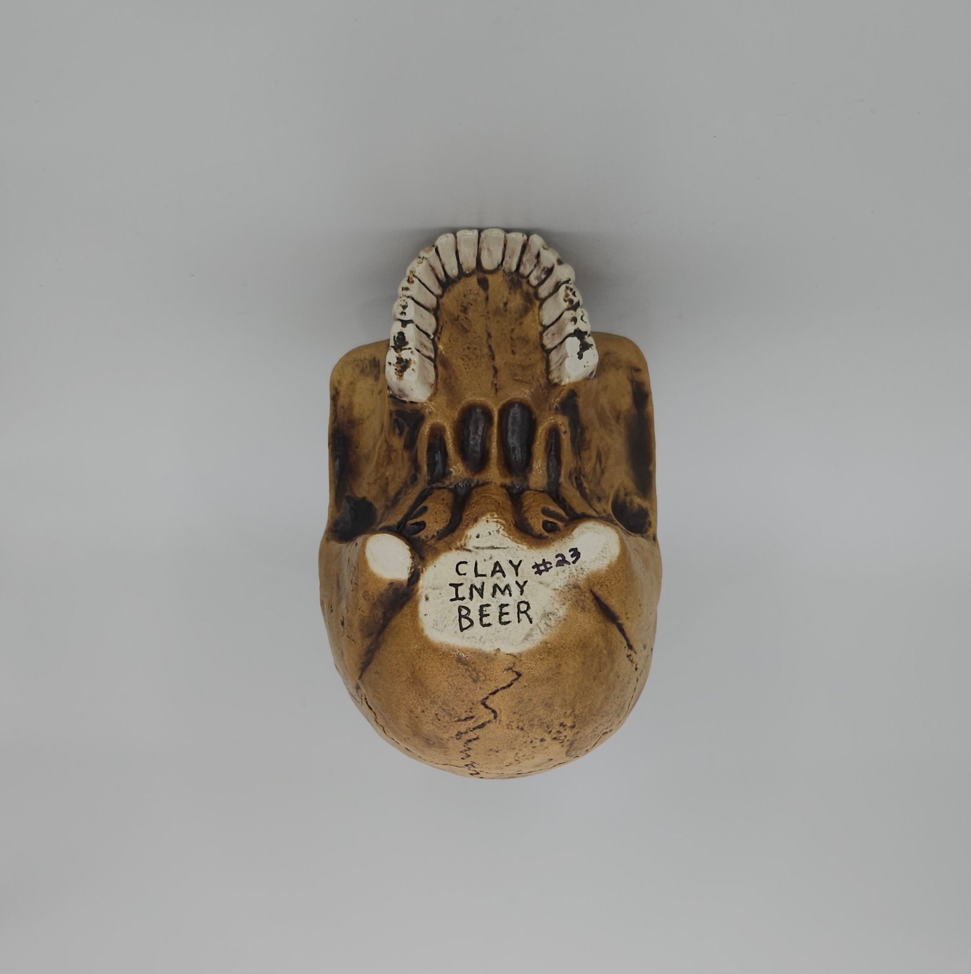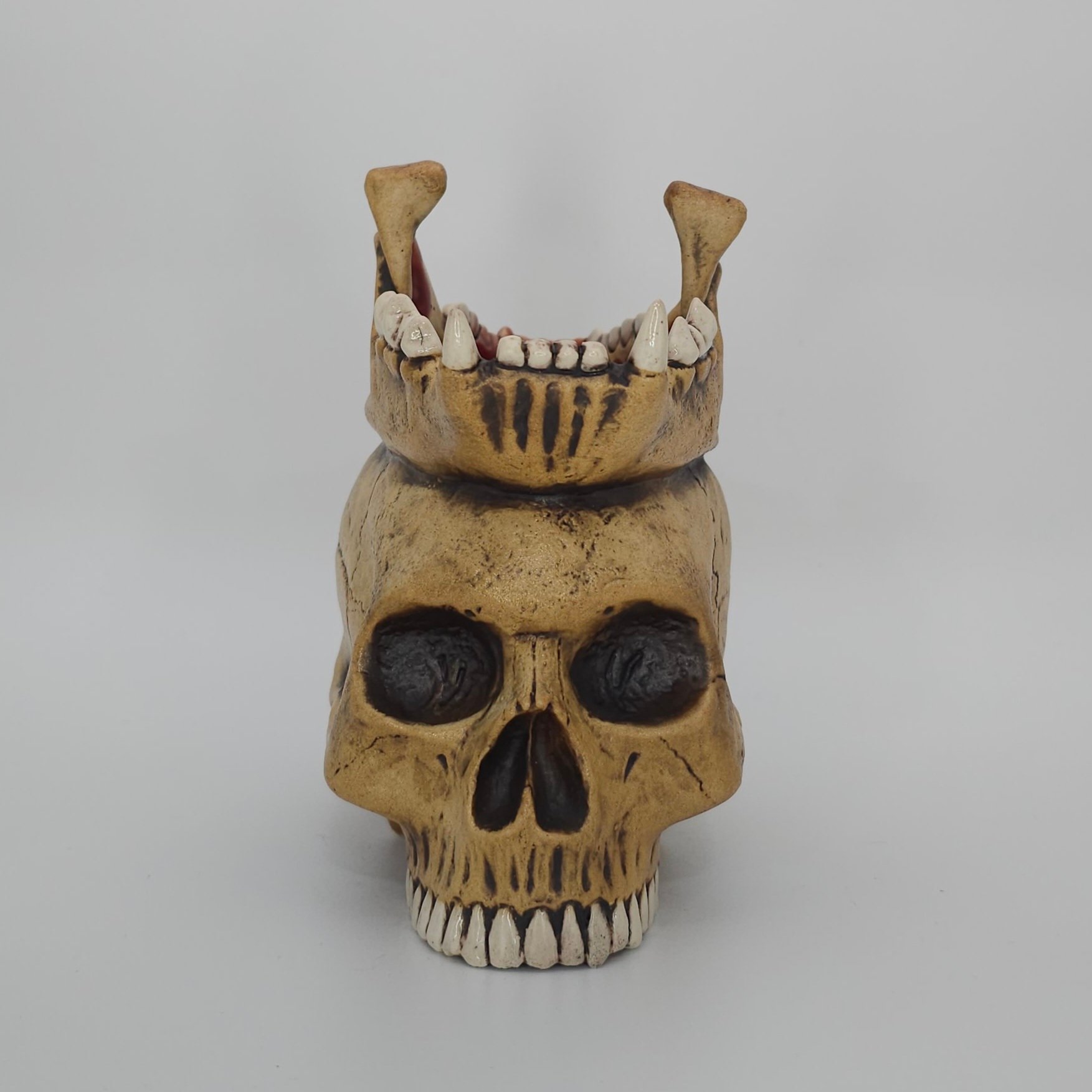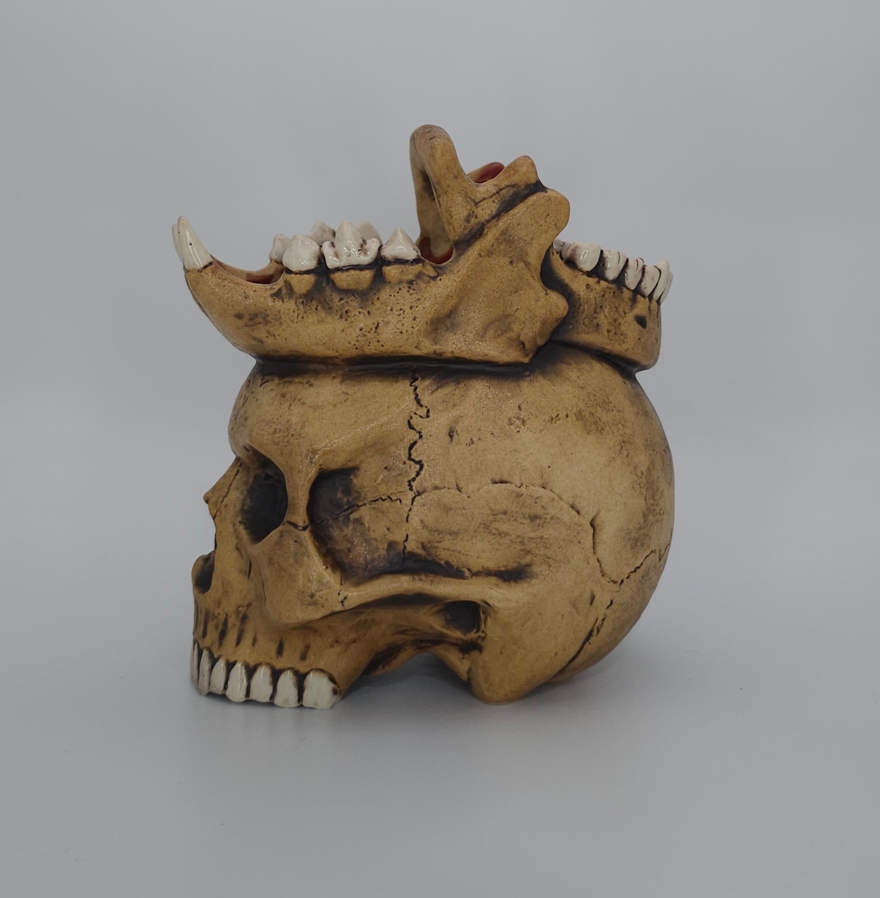 Ceramic skull mug with jaguar and human jawbone crown. Fired to cone 6 (2232 degrees Fahrenheit) and can hold 12-13 ounces, perfect for your favorite cocktail, beer, coffee, or the blood of your enemies. Stop drinking like a peasant, drink like a king!