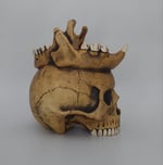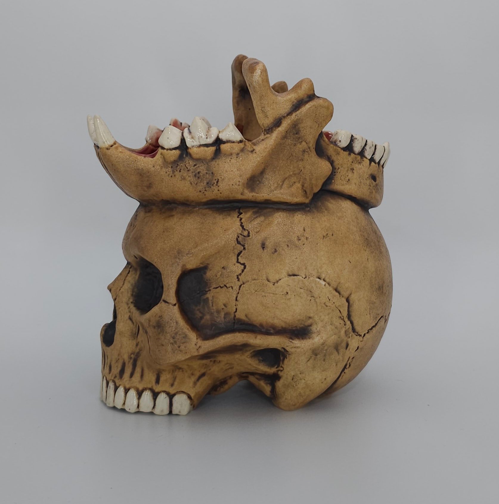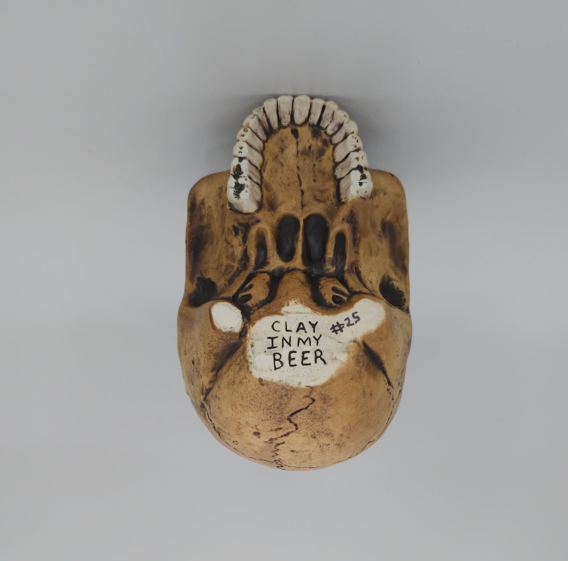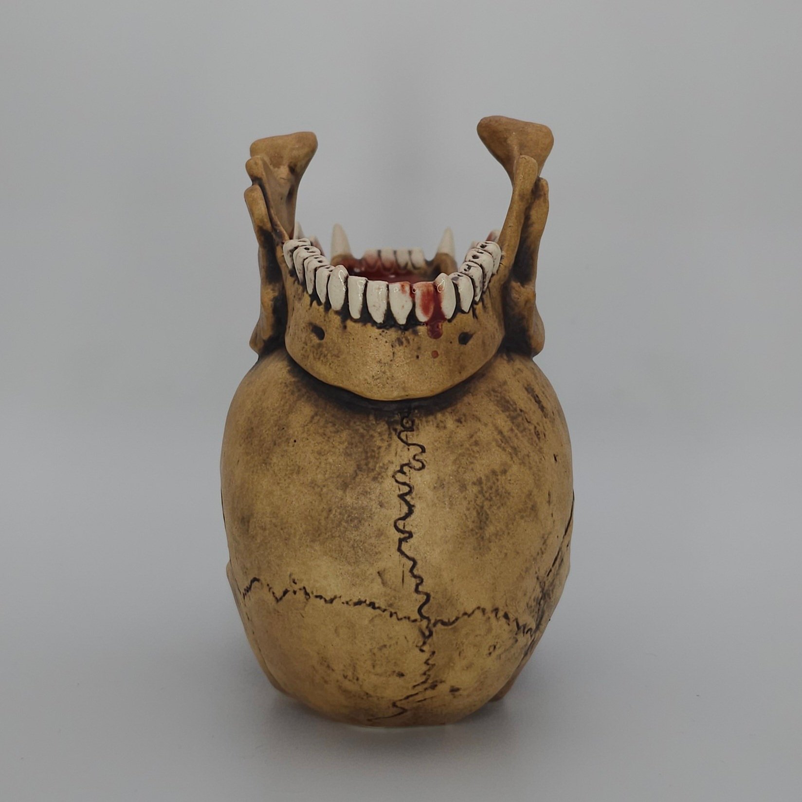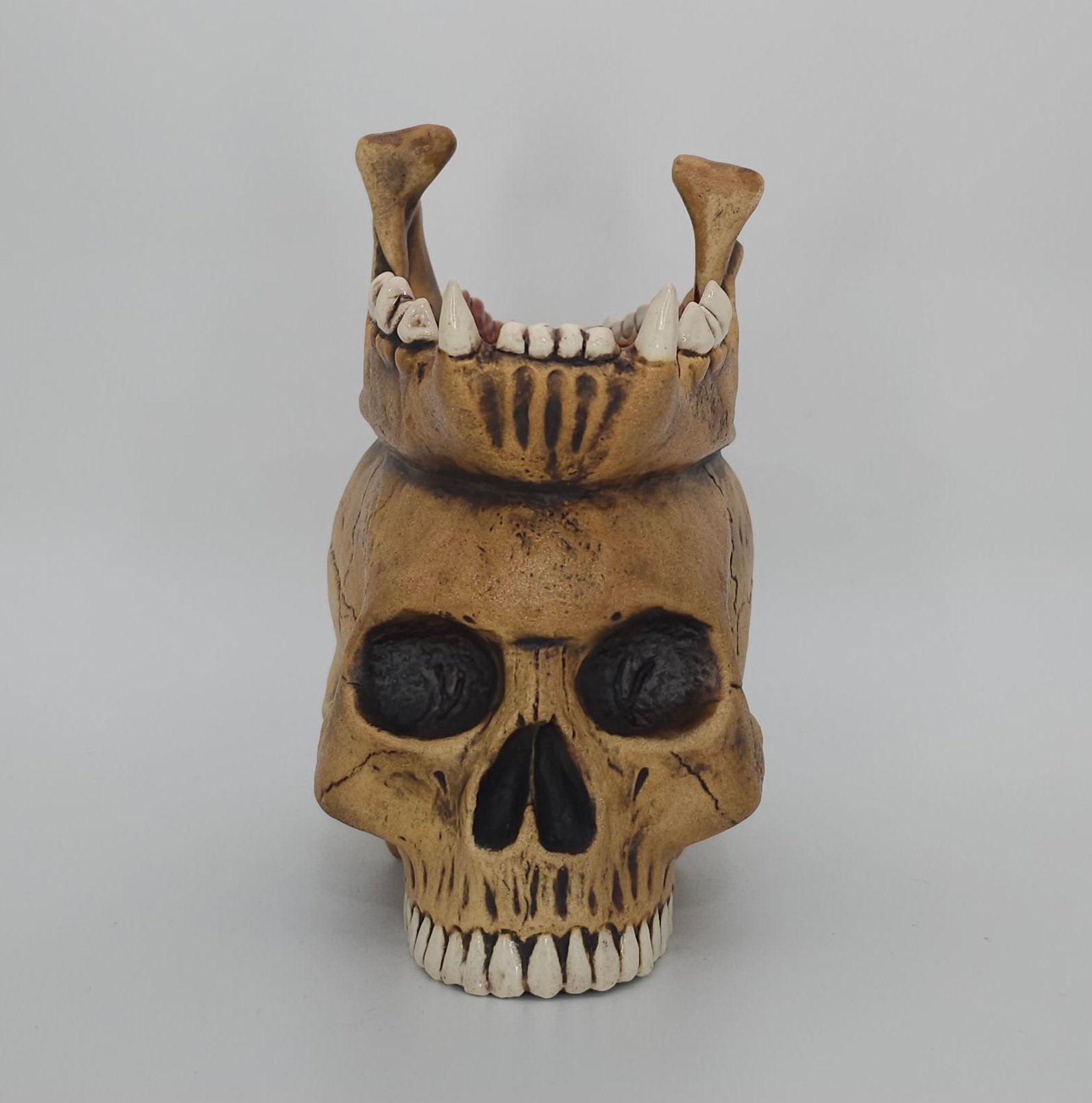Ceramic skull mug with jaguar and human jawbone crown. Fired to cone 6 (2232 degrees Fahrenheit) and can hold 12-13 ounces, perfect for your favorite cocktail, beer, coffee, or the blood of your enemies. Stop drinking like a peasant, drink like a king!