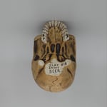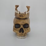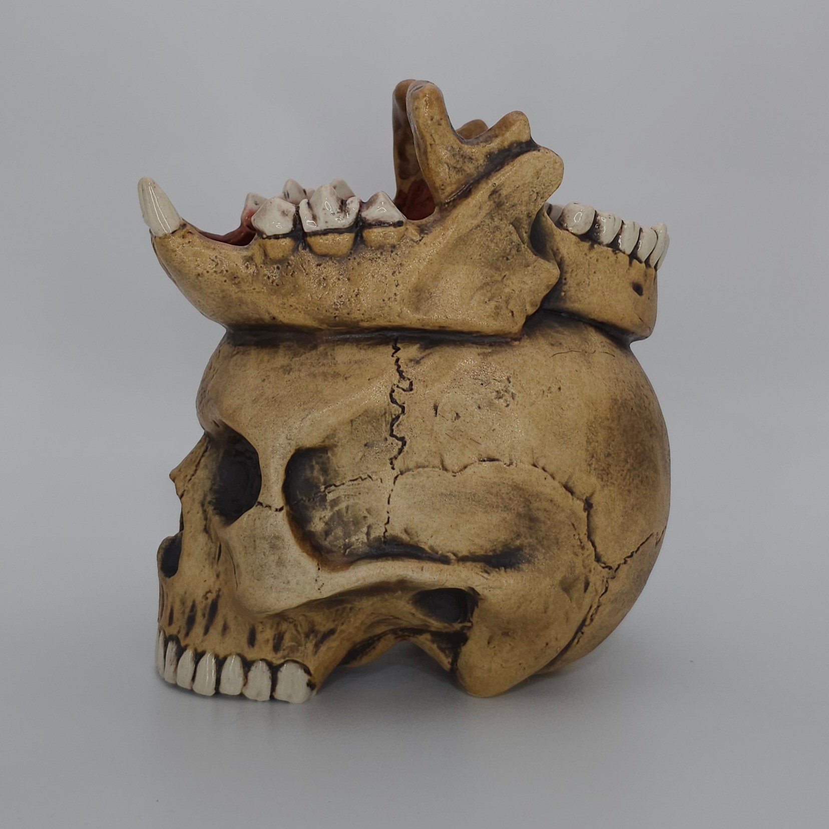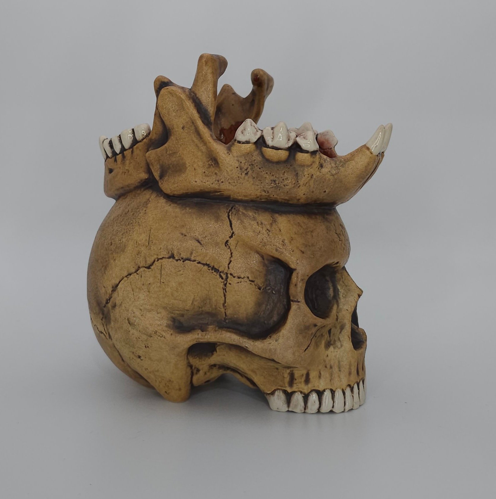 Ceramic skull mug with jaguar and human jawbone crown. Fired to cone 6 (2232 degrees Fahrenheit) and can hold 12-13 ounces, perfect for your favorite cocktail, beer, coffee, or the blood of your enemies. Stop drinking like a peasant, drink like a king!