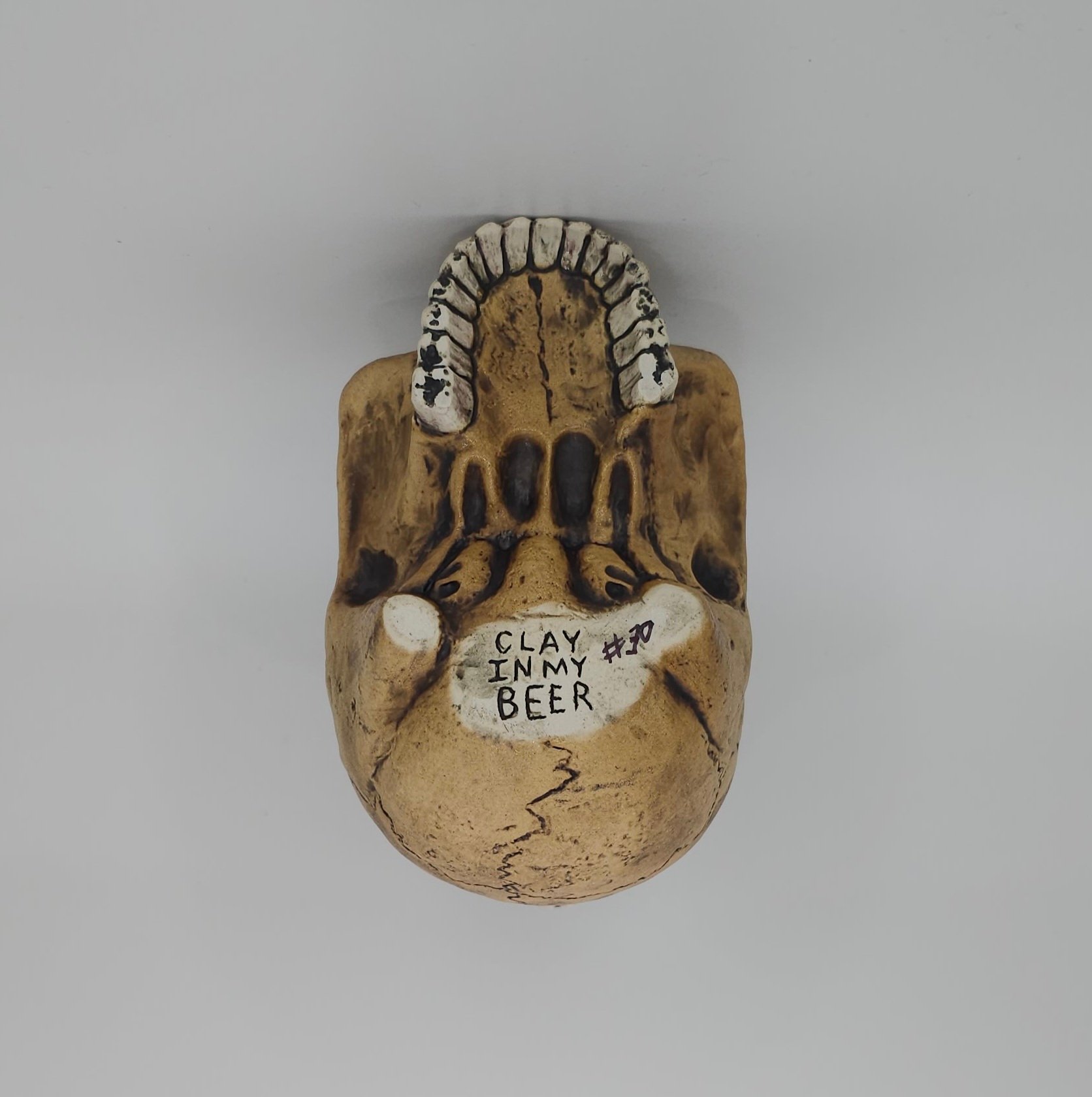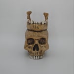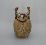 Ceramic skull mug with jaguar and human jawbone crown. Fired to cone 6 (2232 degrees Fahrenheit) and can hold 12-13 ounces, perfect for your favorite cocktail, beer, coffee, or the blood of your enemies. Stop drinking like a peasant, drink like a king!