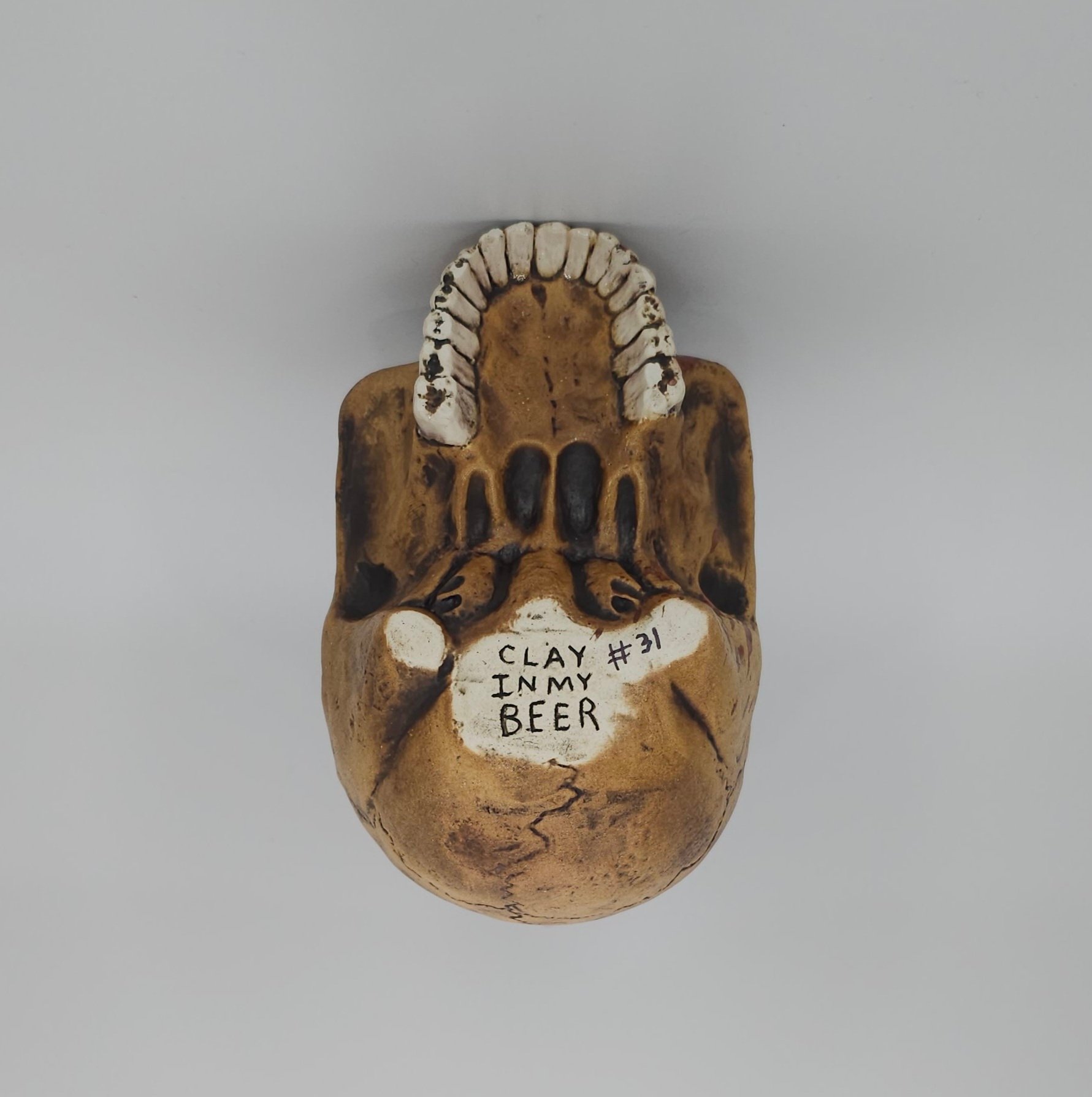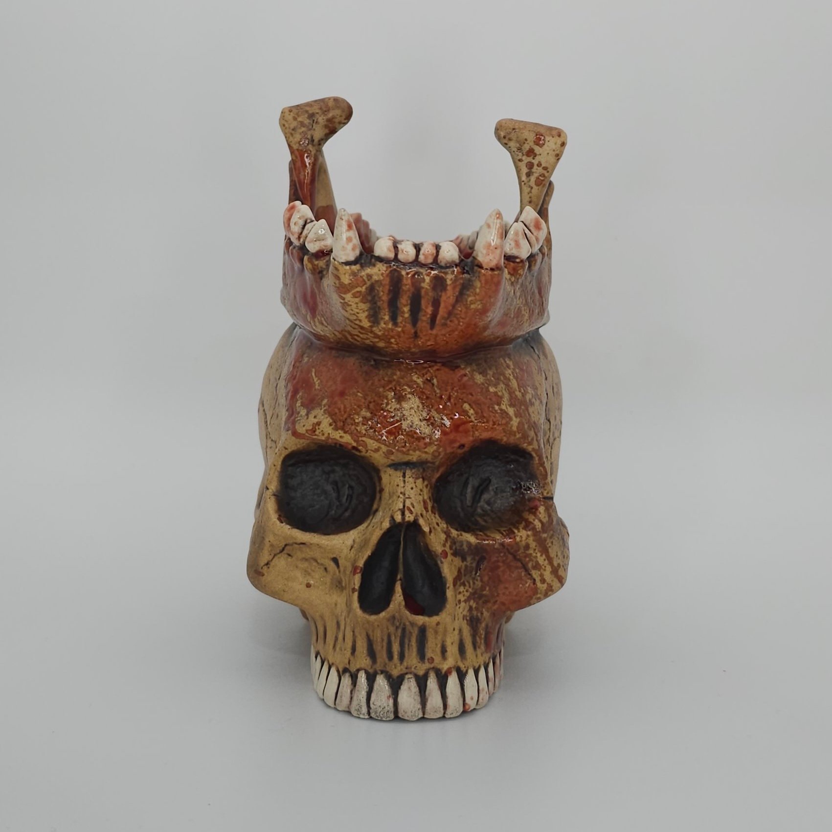 Ceramic skull mug with jaguar and human jawbone crown. Fired to cone 6 (2232 degrees Fahrenheit) and can hold 12-13 ounces, perfect for your favorite cocktail, beer, coffee, or the blood of your enemies. Stop drinking like a peasant, drink like a king!