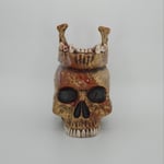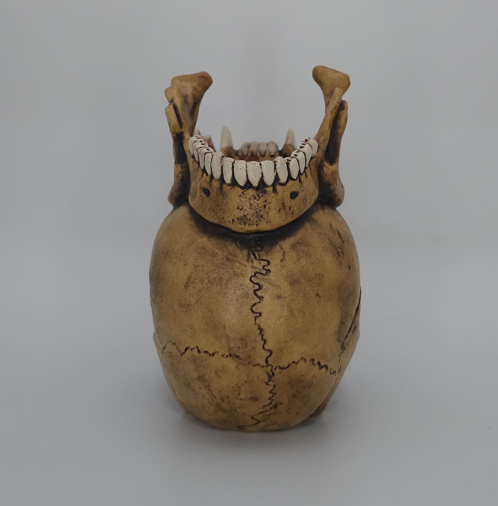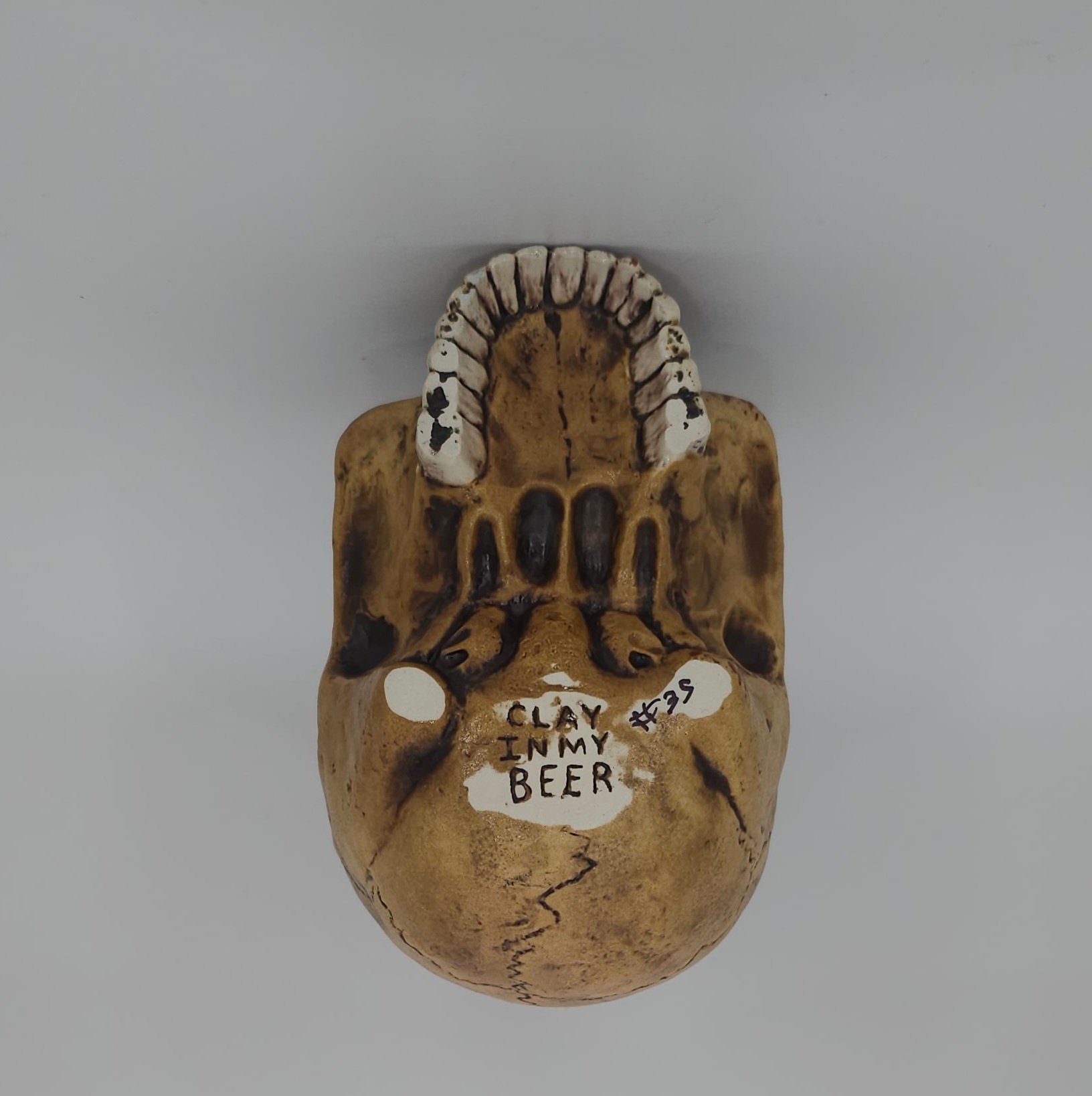 Ceramic skull mug with jaguar and human jawbone crown. Fired to cone 6 (2232 degrees Fahrenheit) and can hold 12-13 ounces, perfect for your favorite cocktail, beer, coffee, or the blood of your enemies. Stop drinking like a peasant, drink like a king!