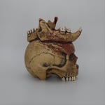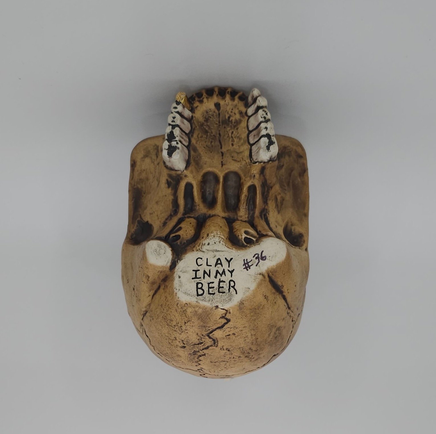 Ceramic skull mug with jaguar and human jawbone crown. Fired to cone 6 (2232 degrees Fahrenheit) and can hold 12-13 ounces, perfect for your favorite cocktail, beer, coffee, or the blood of your enemies. Stop drinking like a peasant, drink like a king!