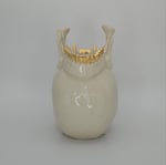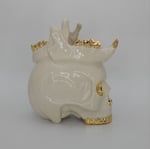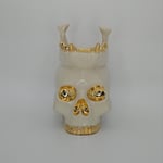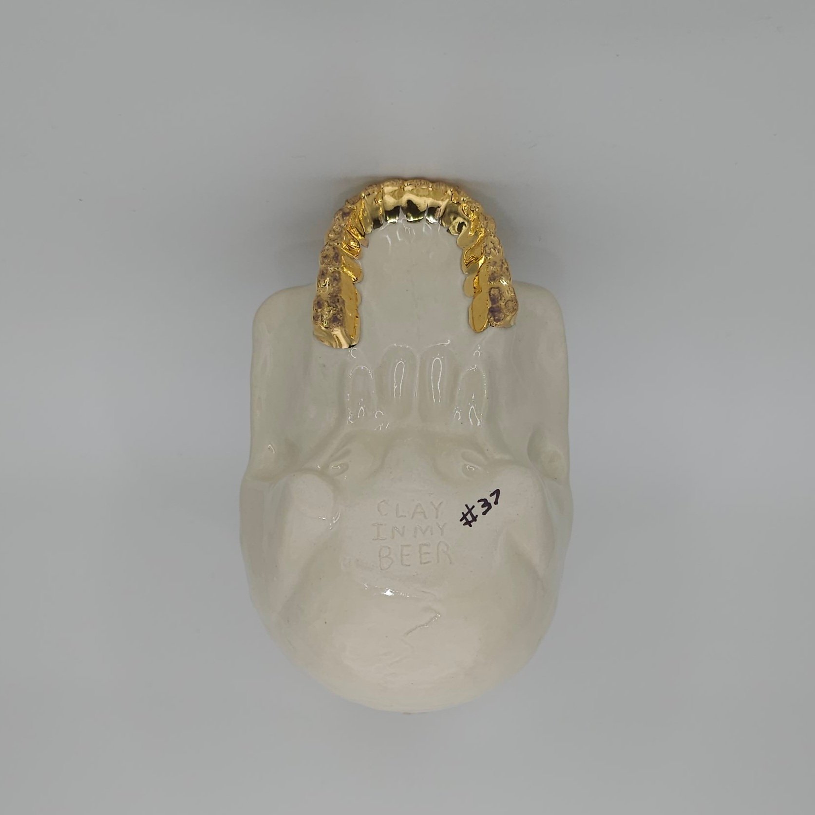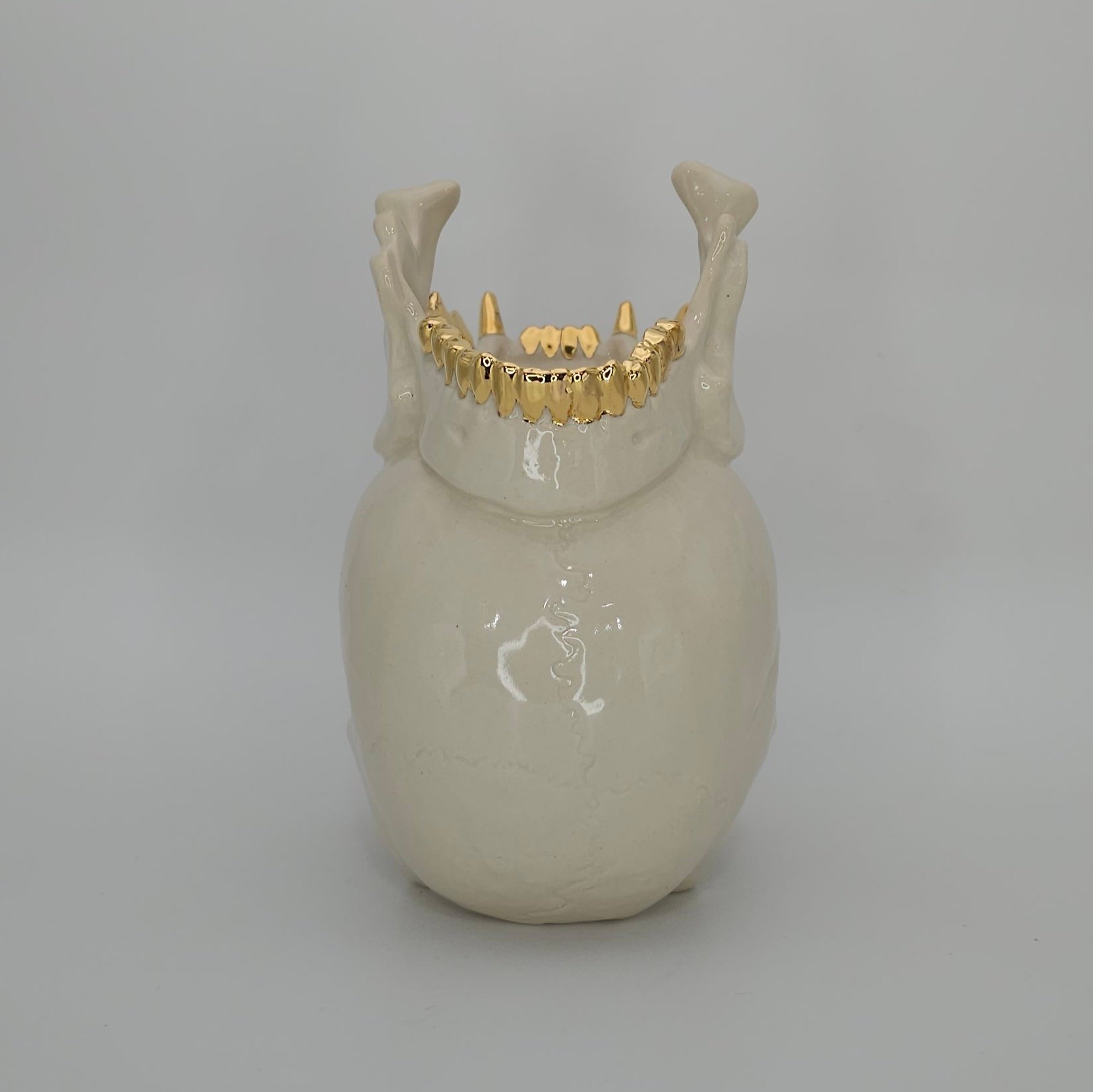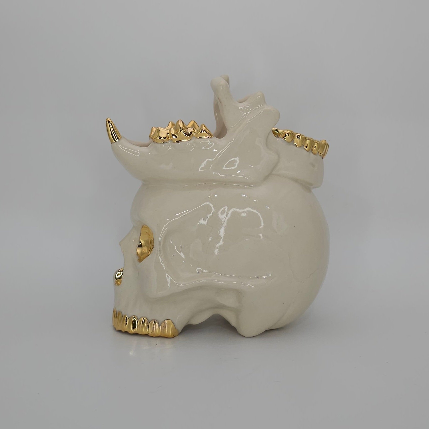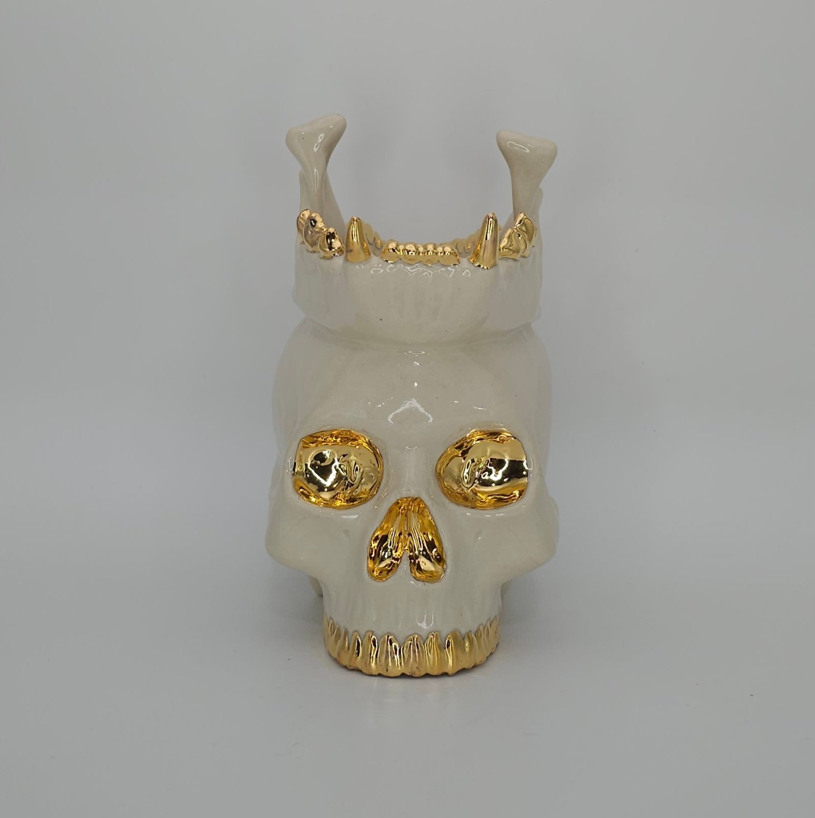 Ceramic skull mug with jaguar and human jawbone crown. Fired to cone 6 (2232 degrees Fahrenheit) and can hold 12-13 ounces, perfect for your favorite cocktail, beer, coffee, or the blood of your enemies. Stop drinking like a peasant, drink like a king!